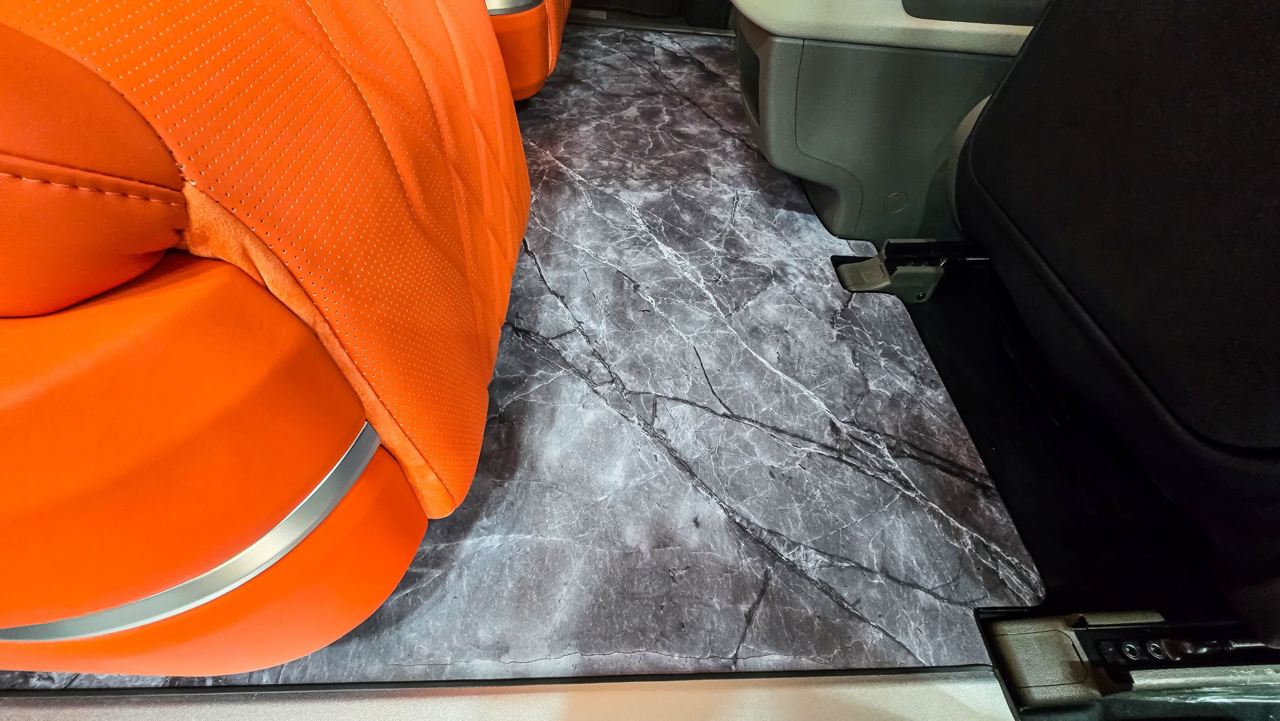 승하차 시 고급스러움을 더하는 도어 스커프와 완벽한 정숙성을 위한 바닥 방음/방진 시공.